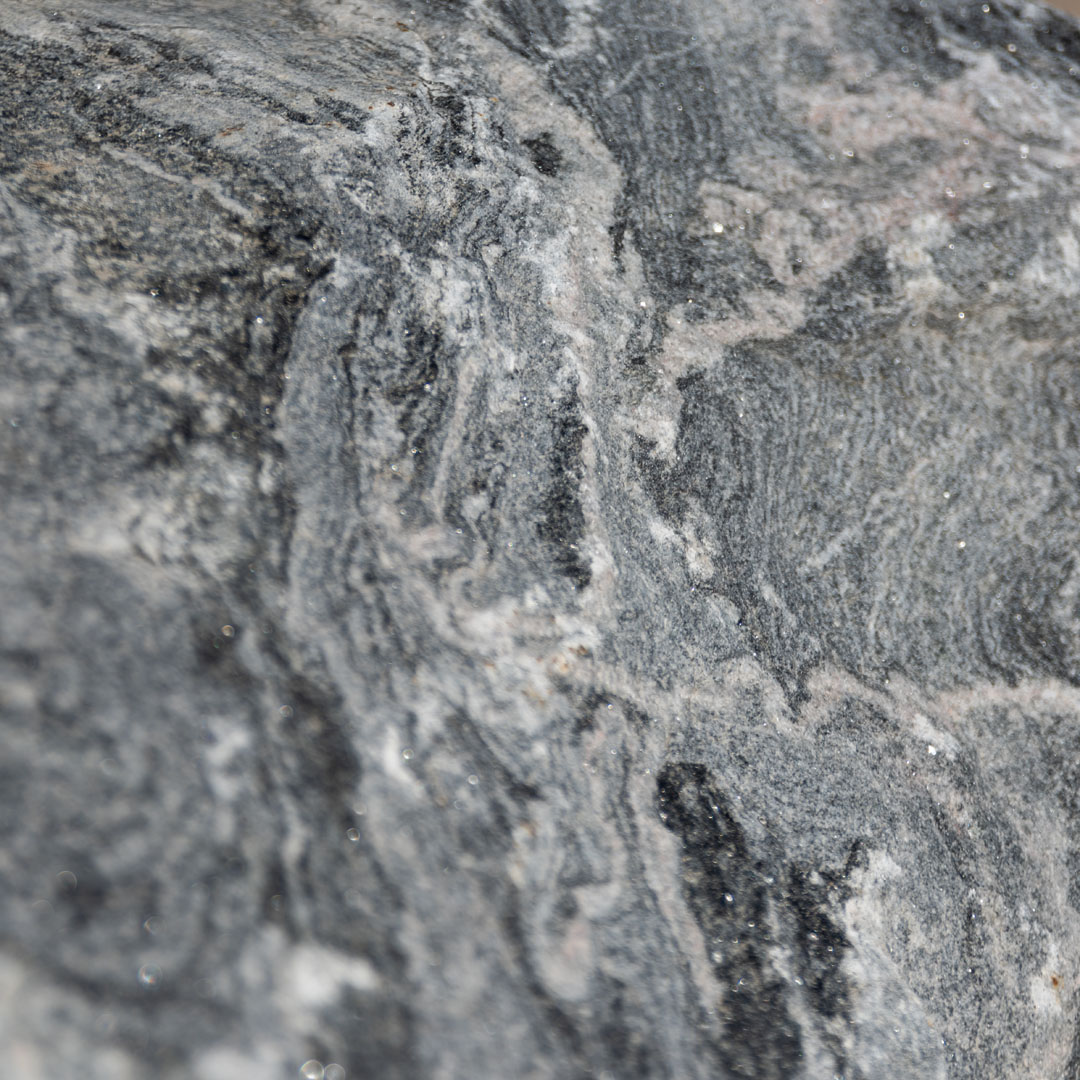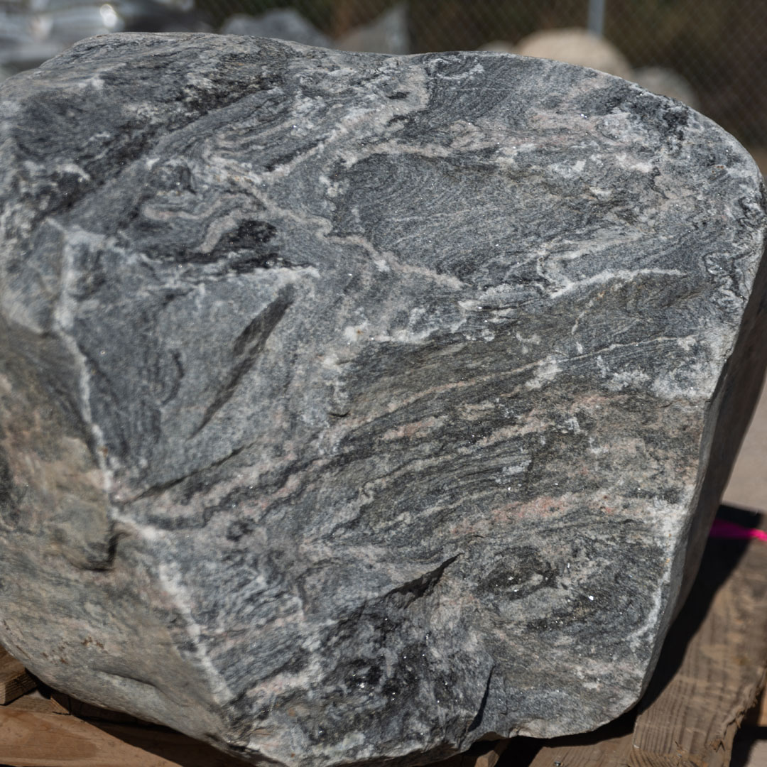 Glacier boulders are naturally greyish in color typically with some whites to blacks swirled throughout. Size varies and these boulders are irregular in shape.