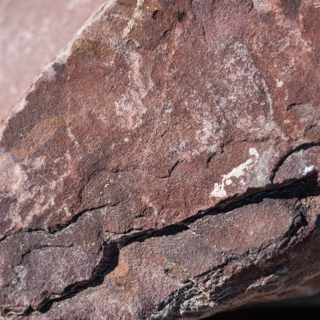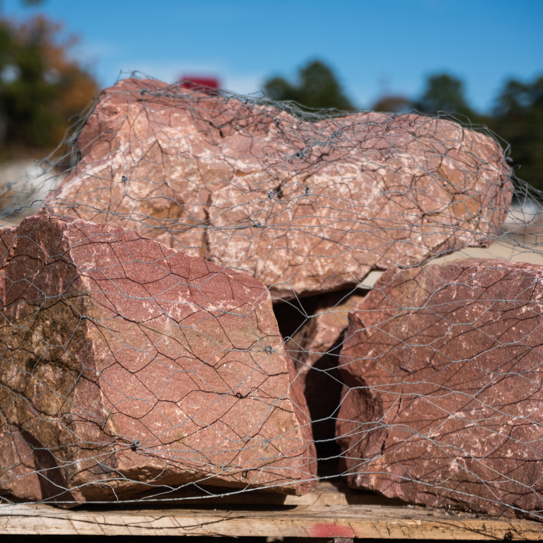 Reddish colored boulders natural in shape and size with some smooth and angular edges.