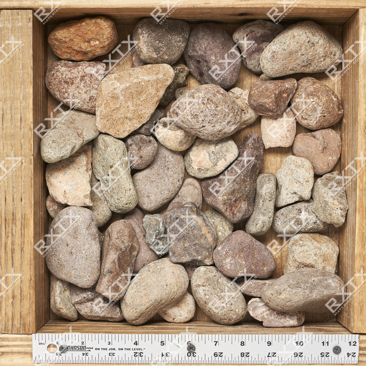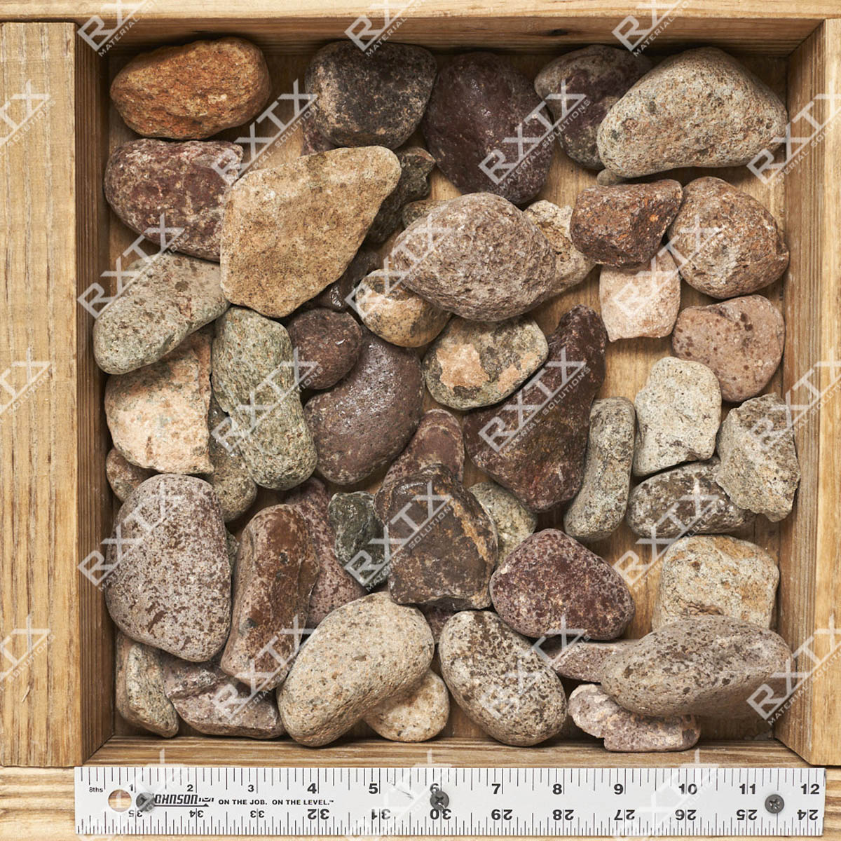 Devil's River blend is a unique river rock with a mix of dark greys, reds and some dark greens. It has a unique texture with a lot of smooth rounds mixed with some coarse rough textured rock. It looks great in all types of landscapes with dark foliage and shrubs.